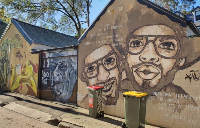 Glebe; Mulga the Artist - near Badde Manors, Wedge Espresso, Lillipad Cafe, loop Cafe, Oh My Days, Chunoma109 Cafe, Sapphos Books…