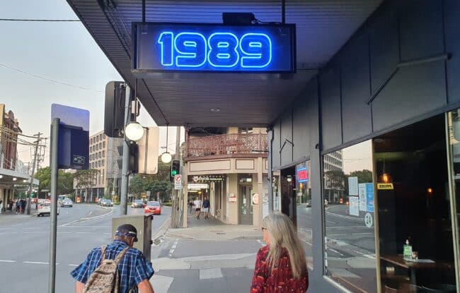 Glebe; near 12 Taps, Badde Manors, Glebe Markets, Gleebooks, Flying Fajita Sisters, Baja Cantina, Sappho Books Cafe and Wine Bar, The Little Guy, The Wedge Espresso…