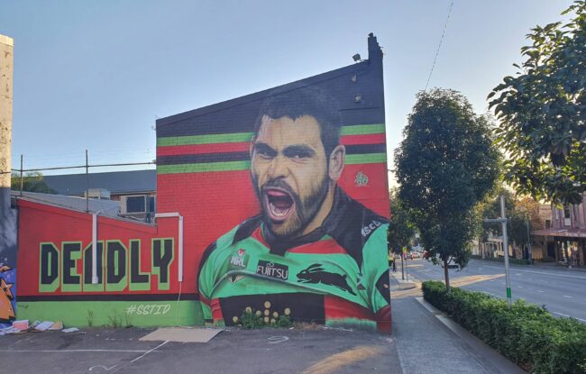 Sid Tapia’s 2018 Redfern Mural of Rabbitoh’s star Greg Inglis is part of an NRL series highlighting the Rabbitohs’ connection to the Redfern community and can be sourced on Woodburn Street, Redfern. ‘Mayking All Things New,’ Sid Tapia’s 2015 Mural commissioned as part of Sydney’s Inner West Council Perfect Match Program, can be seen over on Denison Street, Newtown